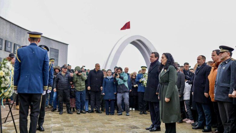 Ndryshe, presidentja Osmani, bashkë me kryeministrin Kurti, kanë vizituar sot Reçakun, ku kanë vendosur kurorë lulesh në memorialin përkujtimor për 45 civilët e vrarë të këtij fshati /Telegrafi/